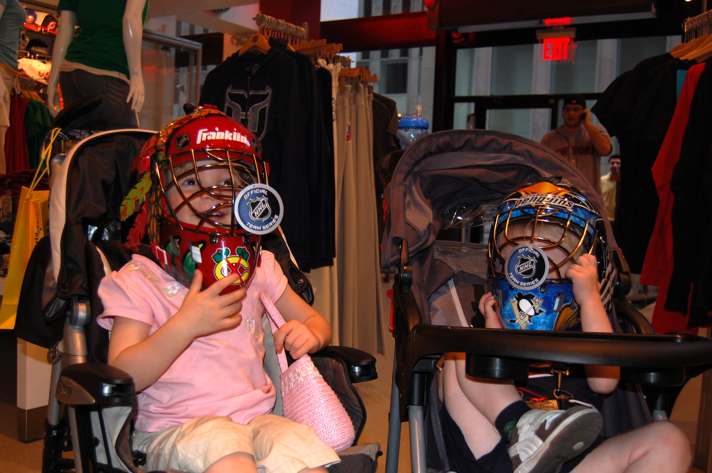 At the NHL store, trying on some gear.