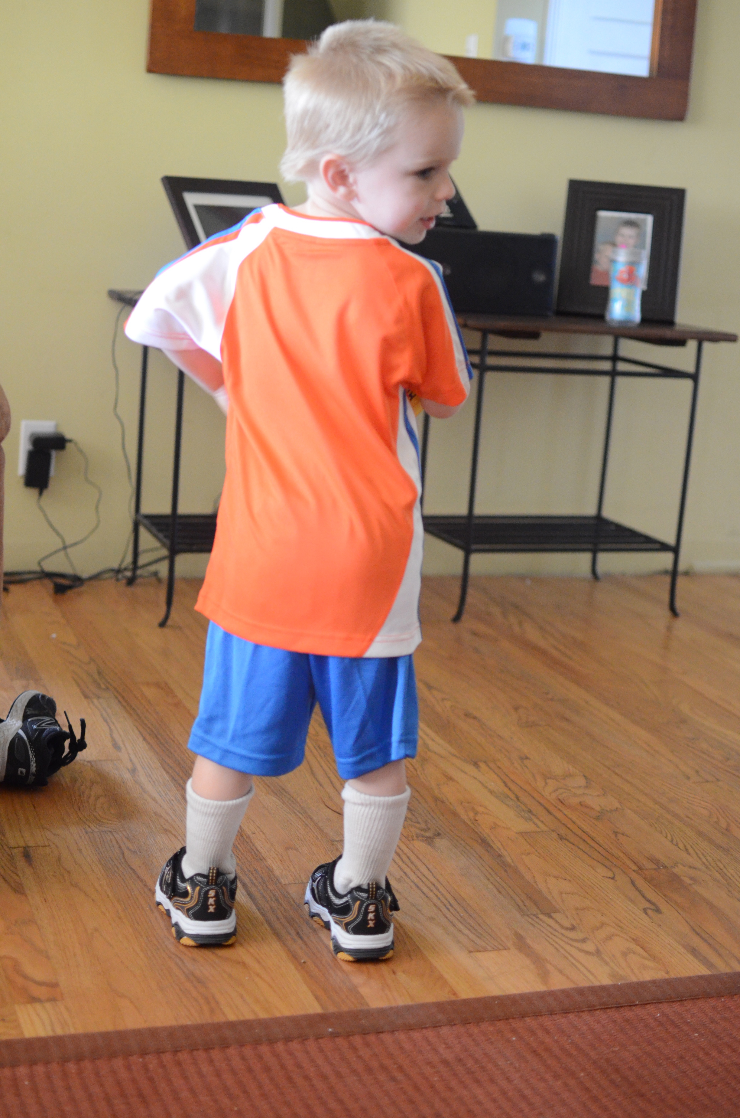 Grant tries out his new soccer jersey, and first says "Take a picture of my butt!"